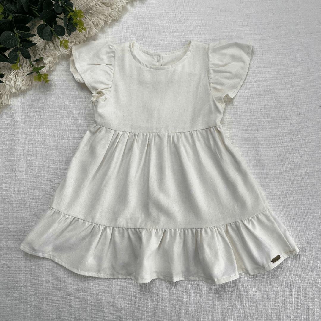 Vestido confeccionado em linho misto, com caimento leve e toque suave, ideal para acompanhar a criança com conforto e liberdade.Possui mangas delicadamente franzidas, recorte na cintura e saia com babado, que trazem movimento e um visual atemporal. A abertura posterior facilita na hora de vestir.