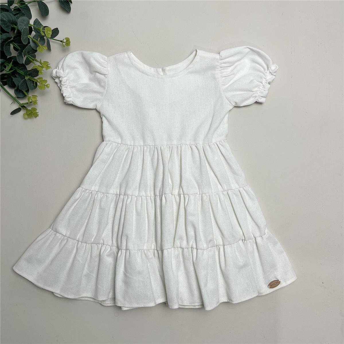 Vestido Canção da InfânciaConfeccionado em linho misto (55% linho e 45% viscose), possui modelagem charmosa com mangas bufantes e saia em camadas que garantem movimento e delicadeza. Uma peça atemporal, fresquinha e confortável para celebrar os momentos mais especiais da infância.