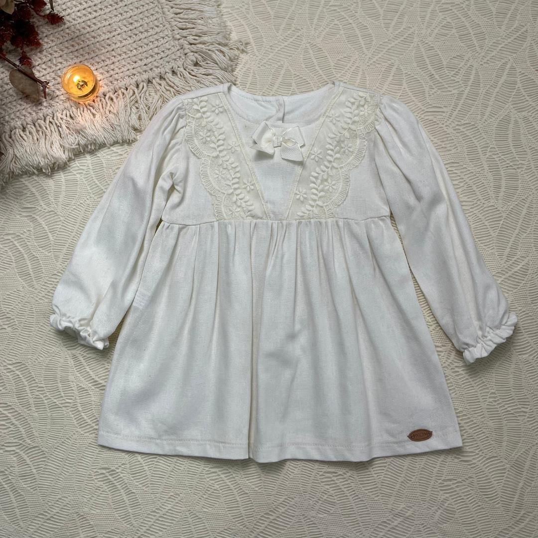 Vestido delicado e atemporal, criado para vestir a infância com leveza, conforto e encanto.Confeccionado em linho misto (55% Linho
